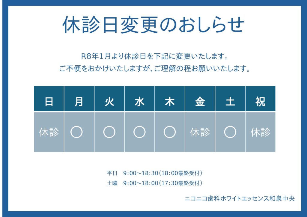 休診日変更のお知らせ 令和8年1月より、休診日を金曜日・日曜日・祝日に変更させていただきます。 ご不便をおかけしますが、何卒ご理解のほどよろしくお願い致します。 診療時間について詳しくはこちら 投稿日:2025年11月7日 カテゴリー:その他 << 11月17日(月)休診のお知らせ || 12月15日(月)、12月25日(木)休診のお知らせ >>