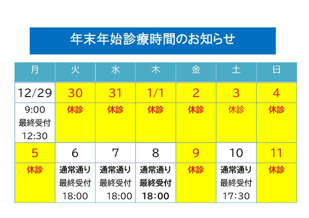 年末年始診療時間のお知らせ 年内は令和7年12月29日(月)12時30分までの受付となります。 年始は令和8年1月6日(火)より通常通り診療いたします。 投稿日:2025年11月20日 カテゴリー:お知らせ << 12月15日(月)、12月25日(木)休診のお知らせ || 12月4日(木)臨時休診のお知らせ >>